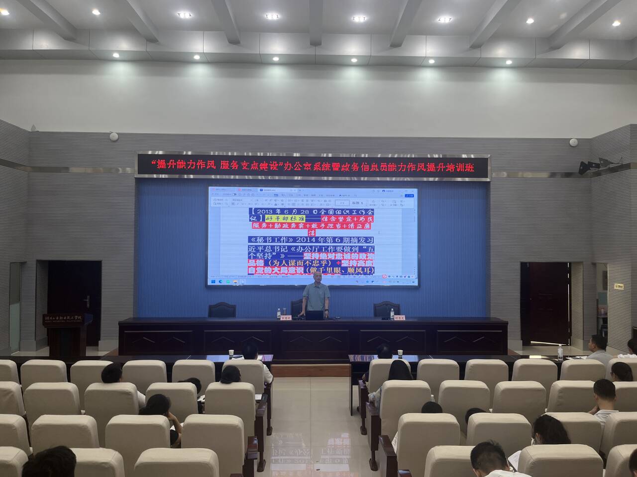 新闻网讯(文/张华雪 图/李鑫)为深入贯彻落实湖北省委“干部素质提升年”工作部署,进一步提升全校办公室系统暨政务信息员能力作风,8月23日至24日,我校在学术报告厅组织开展了“提升能力作风 服务支点建设”办公室系统暨政务信息员能力作风提升专题培训班。校党委副书记、校长郑强出席开班式并讲话,校党委委员、副校长胡昌龙主持并全程参加培训,校属各单位(部门)政务信息员、办公室主任及综合岗人员,各二级学院办公室主任、教学办主任、学工办主任,校党政办全体人员及部分新入职青年教师参加培训。